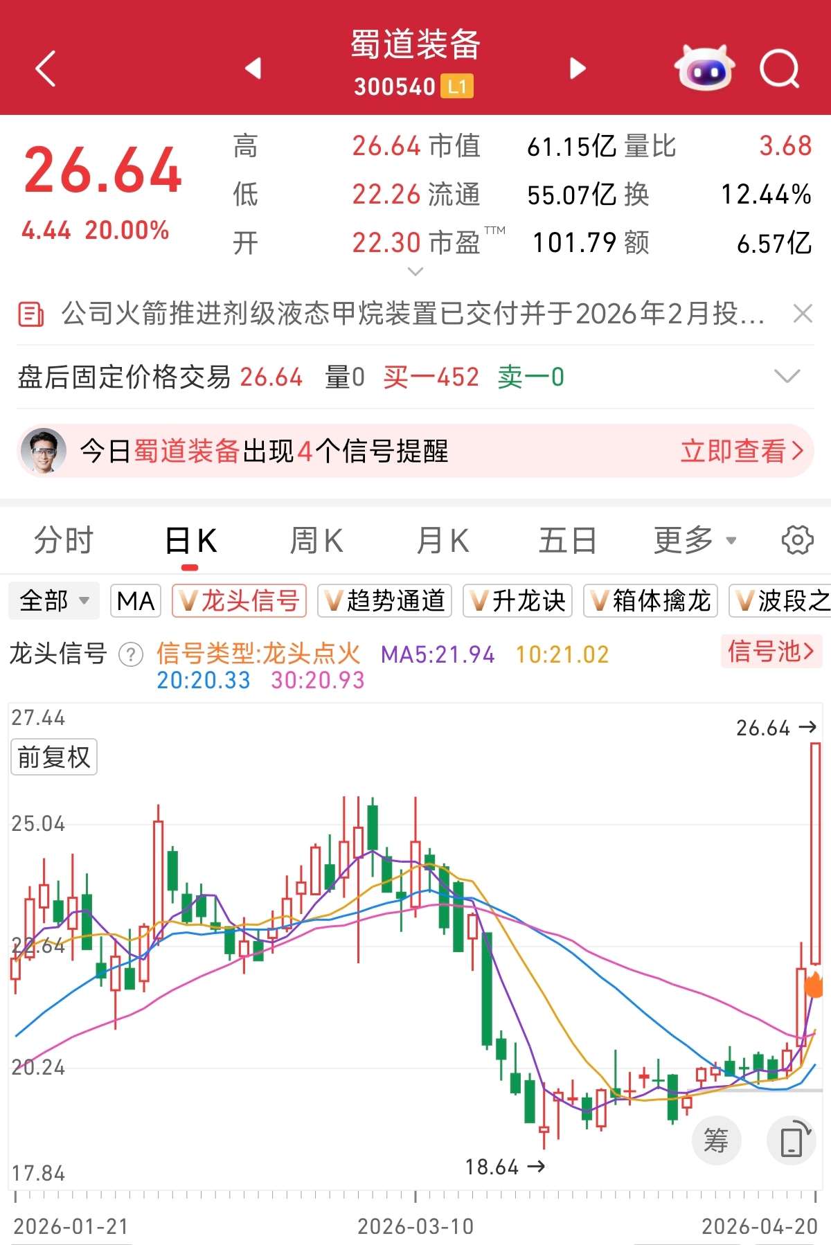 根据龙头信号监控,近日大涨的蜀道装备,在4月20日出现龙头点火信号,感兴趣的朋友可以自行跟踪判断。当前有7天体验价活动,只要30元。