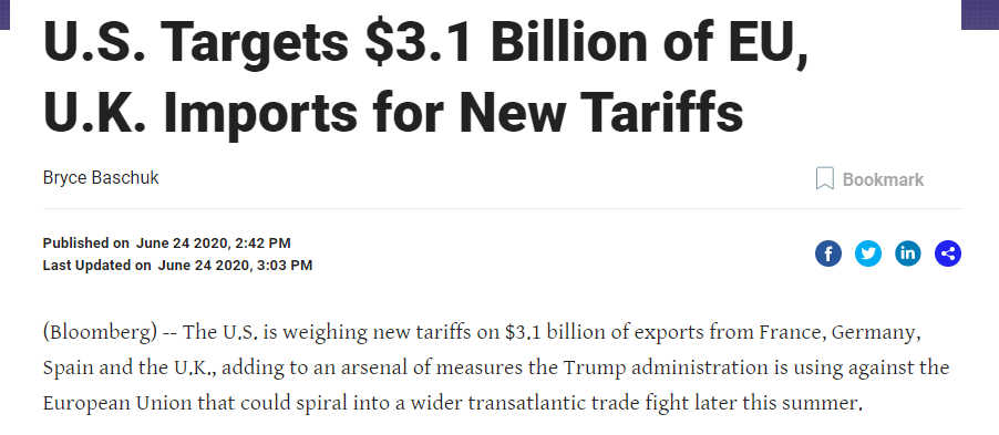 是何原因导致美方突然向欧洲出手?就在昨天,据彭博社报道,欧盟已要求世界贸易组织(WTO)批准对价值112亿美元的美国商品加征关税,这将打击农民、煤炭生产商和渔业。这也将严重影响到特朗普的选情。而在此前,欧洲方面也在讨论,因为美国防控疫情不到位,在其开放边境的时候,不会允许美国人入境。