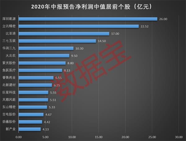 以披露的2020年中报预告净利润中值计算,目前已有5股的半年度归母净利润超过十亿元。其中深圳能源和立讯精密的预告净利润中值最高,分别达到26亿元和22.5亿元,其他较高的还有比亚迪、三七互娱、华润三九等。