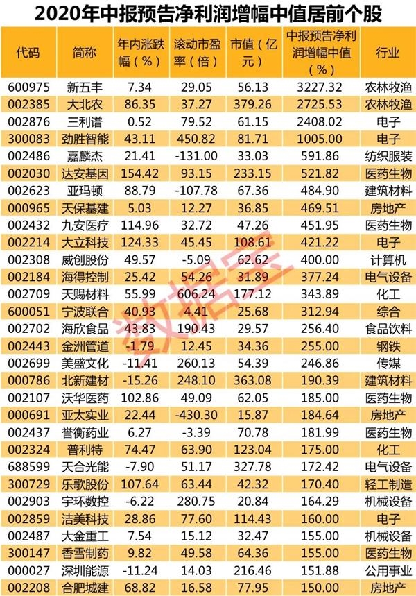 18股净利润预告增幅中值超200%,新五丰预告净利增幅中值高达3227.32%,位居榜首;大北农、三利谱次之,增幅中值分别为2725.53%、2408.02%;其他增幅中值较高的还有劲胜智能、嘉麟杰、达安基因等,净利预告增幅中值都超过5倍。