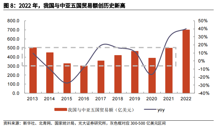 随着一带一路推进,我国与中亚五国经贸活动日益密切。2013-2021年我国与中亚五国贸易额基本保持在300-500亿美元区间内;2022年,中国与中亚五国贸易额达702亿美元,创历史新高,同比+40%。
