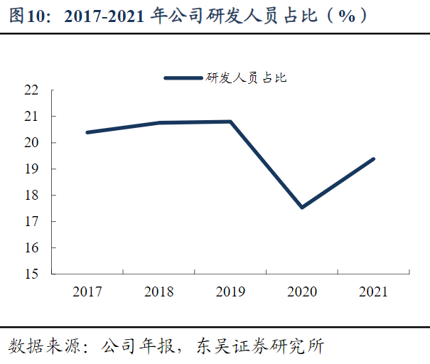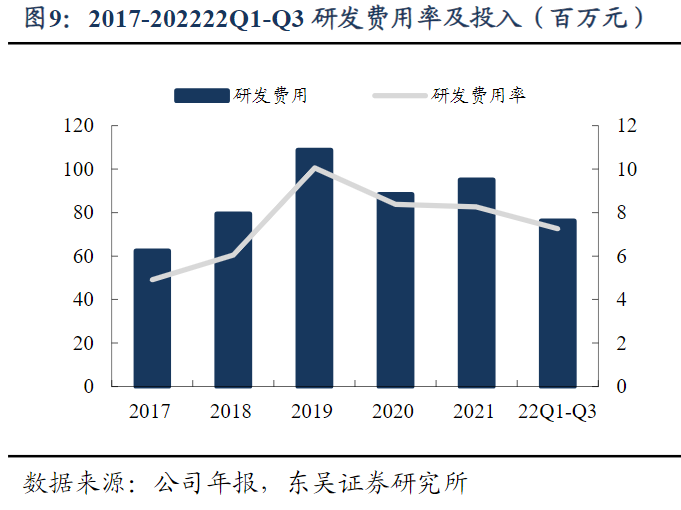 公司保持较高研发投入,加速新产品开发,产品线扩充+扎实基础技术,加快新能源汽车领域与轨道交通领域新产品的研发,研发投入保持逐年增长趋势。2020-2022Q1-Q3研发投入金额分别为8822万元、9497万元、7604万元,占营业收入的8.4%、8.3、7.3%。