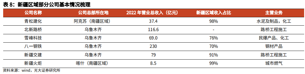由于新疆-内地货运成本限制,内地的部分产品和原材料较难对疆内市场供给造成冲击。因此,在当地及中亚需求向好的背景下,机构看好新疆本土企业未来将享受长期发展红利期。尤其是存在基础设施建设“补短板”需求的喀什地区所在的南疆区域或将会是新疆腾飞最具弹性的区域。