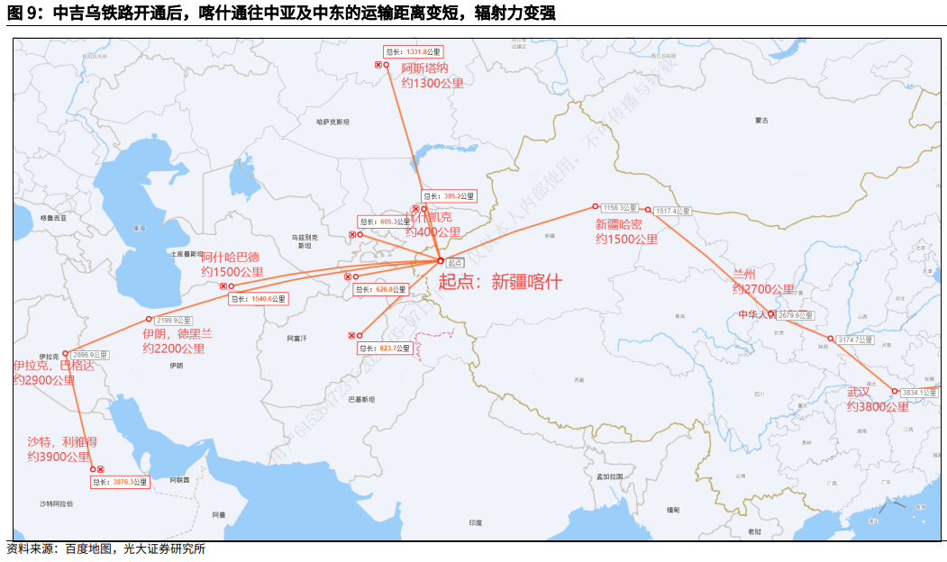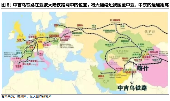 其中,将于2023年秋季开建的以中吉乌铁路为代表的泛亚铁路网建设,或将使新疆的产品及产能供应辐射至整个中亚,其供给半径大幅扩容。该铁路通车后,将成为我国到中东、欧洲地区的最短铁路货运线路,货运路程缩短900公里、时间节省7-8天。铁路开通后,我国与中亚乃至中东、欧洲的货运成本将大幅降低。