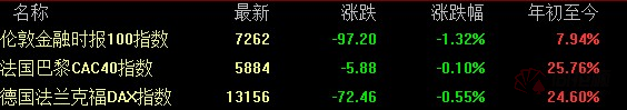 欧洲股市集体下跌,截止发稿时间,德国DAX指数跌0.55%,英国富时100指数下跌1.32%,法国CAC40指数跌0.10%。
