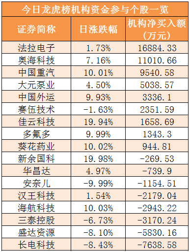 盘后龙虎榜数据显示,机构现身17股,其中法拉电子等9股呈现机构资金净买入,长电科技等8股呈现机构资金净卖出。
