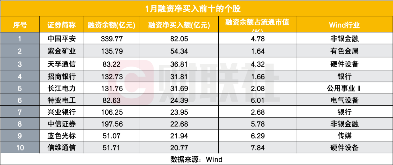 个股方面,1月融资净买入前十的标的涵盖了多个行业的龙头企业,资金集中趋势明显。中国平安以82.05亿元的融资净买入额成为全月最受青睐的个股,融资余额达到339.77亿元,占流通市值比例4.78%。紫金矿业融资净买入54.34亿元,融资余额135.79亿元,作为有色金属行业的代表性企业,获得资金重点布局。
