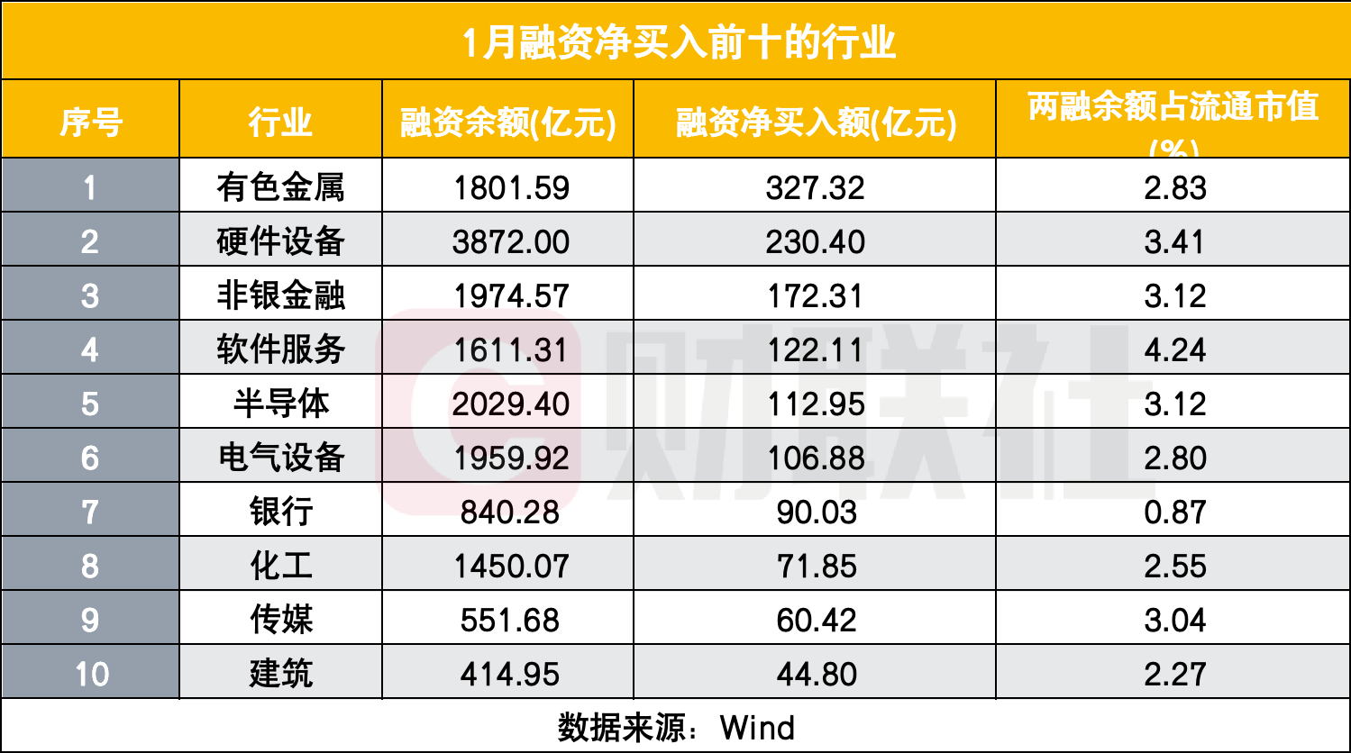 在1月融资市场整体活跃且后半程逐步降温的背景下,资金的行业和个股偏好呈现出鲜明特征,有色金属、硬件设备、非银金融等行业成为开年融资资金的重点布局领域,龙头个股获得资金集中青睐。