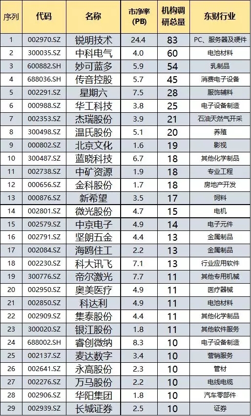 其中,锐明技术、中科电气、妙可蓝多这3只个股被金融机构密集调研超过50次;传音控股、星期六、华工科技、杰瑞股份这4只个股被密集调研超过20次。