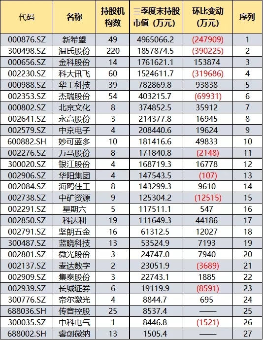 值得关注的是,这27只个股已经被金融机构重仓持有(去年三季度末机构进入前十大流通股股东名单),机构合计持股市值1349亿元。详见下表: