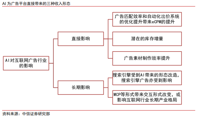 1)头部互联网厂商积极探索AI与自身现有生态的融合,中长期维度,该行认为AI将在广告营销、内容创造、搜索等多个方面重塑互联网大厂的主要业务,头部互联网厂商有望通过AI化的契机进一步加深自身业务护城河,并在多个方向探索货币化的机会。在内容制作和营销方面,AI亦见到实际经济效益,算法能力提升带来了头部互联网广告平台的广告分发和匹配效率的升级;而生成式模型的能力亦丰富了内容制作时的创意选择、降低了内容创作的成本与难度。