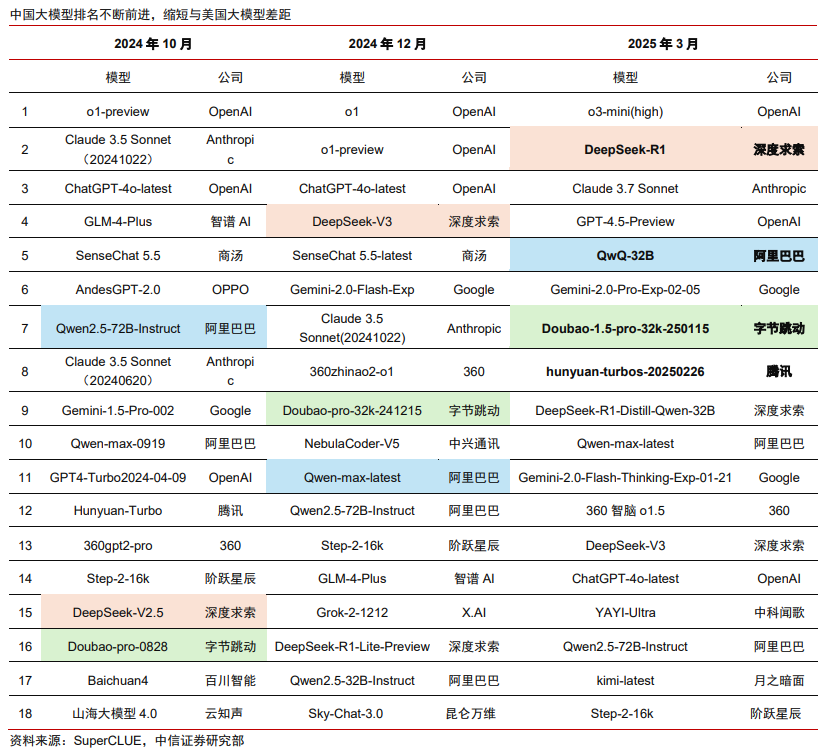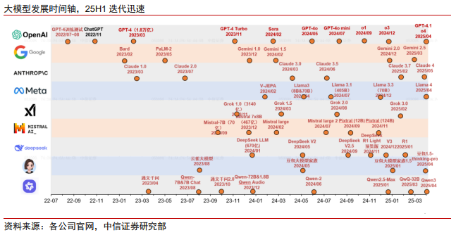1)从基座模型看,2025上半年,大模型的性价比快速提升。一方面表现为模型的内生能力快速进步,包括推理、工具调用能力;另一方面表现为模型的定价整体降低,这受益于模型开源和硬件效率的提升。其中,以DeepSeek、Qwen、豆包为代表的中国厂商正在迅速缩窄与美国头部大模型厂商的能力差距,并极大推动了模型平权;