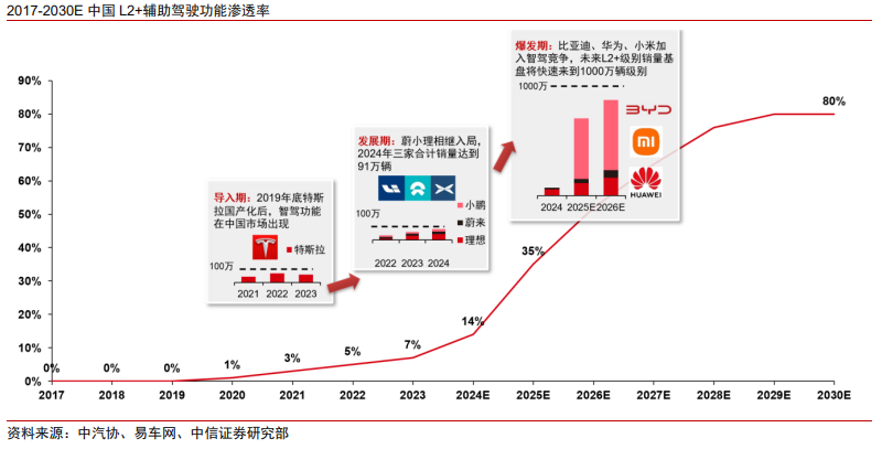3)智能汽车有望成为继PC、手机后的下一个互联网入口。在销量方面,该行预计在中性假设下,2025年中国汽车总销量有望达到3344万辆,同比+6.4%。其中,乘用车行业销量(含出口)将达到2,924万辆,同比+6.4%。此外,欧盟对中国电车的限制或出现转机,合作共赢有望成为新主题,该行持续看好中国汽车行业的出海机会,预计2025年出海销量有望达到674万辆,同比+15.3%,其中乘用车570万辆,同比+15.0%,新能源车出口预计将达到180万辆,同比+47%。同时,汽车智能化和电动化趋势进一步加速,2025年L2+渗透率有望实现翻倍提升,高速/城市NOA车型的销量占比有望提升到35%,带来智驾芯片、激光雷达等细分方向的投资机遇。