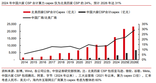 3)从算力基建看,北美、中国算力投入均处于较高水平。2025Q1四大CSP资本开支合计同比+60%,全年指引好于预期。中性假设情形下,该行预计2025年北美四大CSP 合计资本开支为3450亿美元,同比2024年+37%。国内方面,2025Q1季度,阿里巴巴/腾讯分别投入资本开支246/275亿元,同比增长141%/91%。针对云业务,当前市场需求蓬勃,AI对现有业务,尤其是广告和推荐系统的优化具备确定性。该行预计中国互联网巨头将维持战略定力,继续围绕云及AI持续投入。