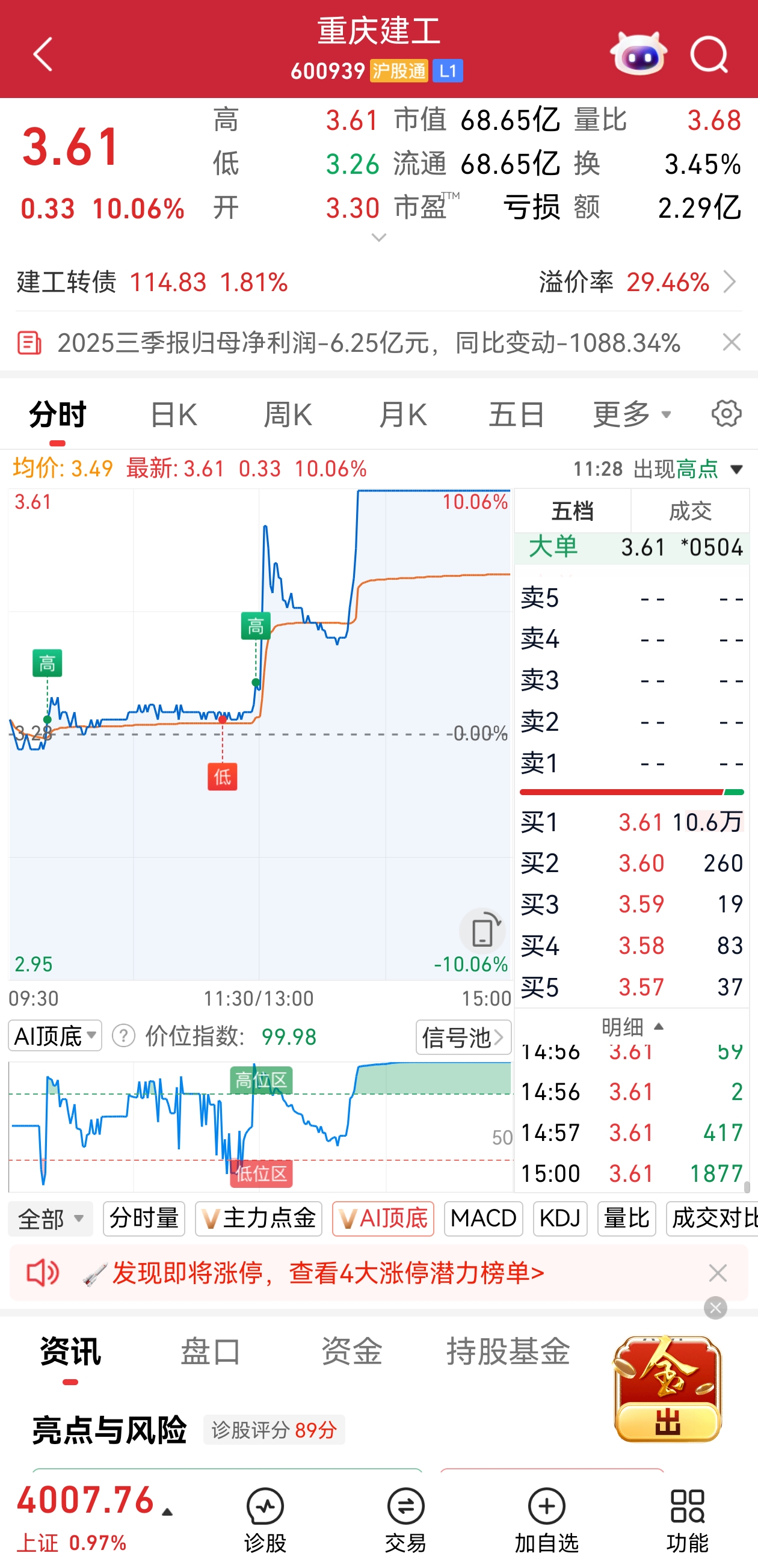 工业金属板块今天表现强势。其中,中国铝业涨停后多次开板,收盘上涨10.03%,总市值为1863亿元。重庆板块午后拉升,其中,重庆建工直线涨停,涨停板上超10万手封单。