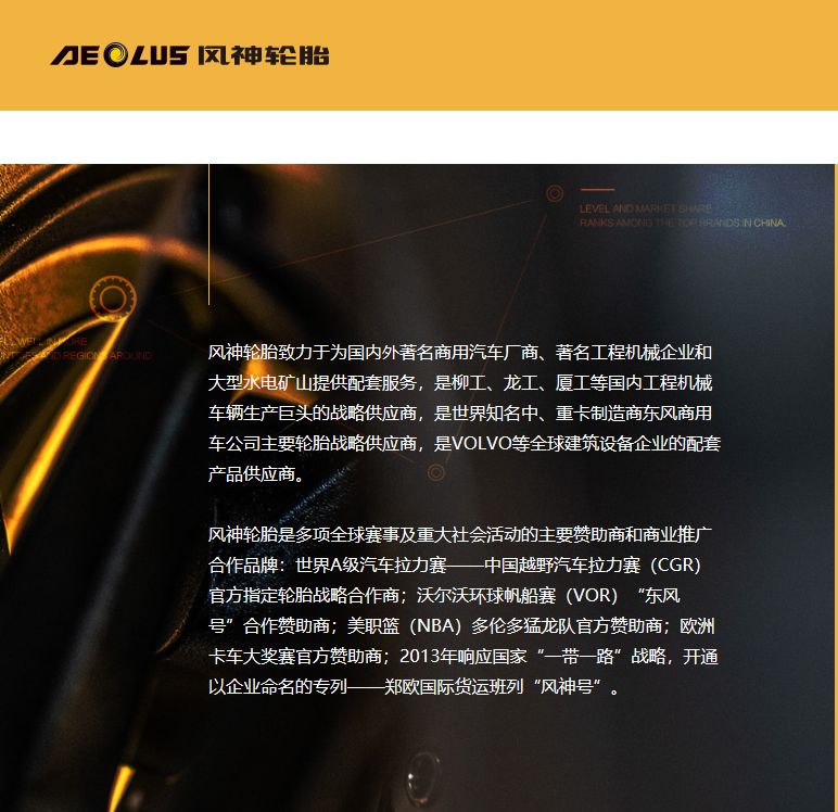 风神轮胎股份有限公司(以下简称风神轮胎)始建于1965年,是轮胎行业唯一由央企——中国化工集团公司(世界500 强,2018年排名167位)控股的国有上市公司,年产卡客车轮胎700万套,工程机械轮胎80万套,位居行业前茅。旗下拥有“风神”、“风力”、“卡之力”、“双喜”、“黄海”等多个品牌1000 多个规格品种。国内在焦作、太原、青岛拥有三个生产基地,全球拥有倍耐力工业胎10% 股权,产品畅销全球140 多个国家和地区,在海外市场尤其是欧美高端市场的产品价格水平和市场占有率名列前茅。