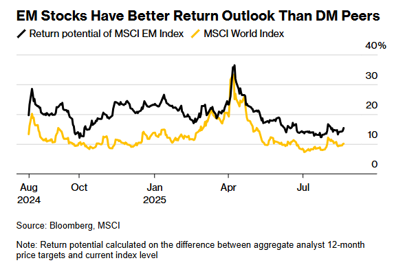根据对业内分析师的调查预估,MSCI新兴市场股票指数在未来12个月预计将上涨约15%,而其发达市场同类指数涨幅预计将仅为10%。