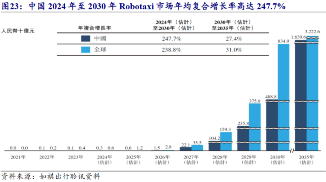开源证券的研报也表示,随着Robotaxi技术成熟、成本下降、用户接受度提高,有望替代逐步扩大市场份额。根据如祺出行数据,中国2024年至2030年Robotaxi市场年均复合增长率高达247.7%,在2030年国内市场份额有望达到4888亿元。