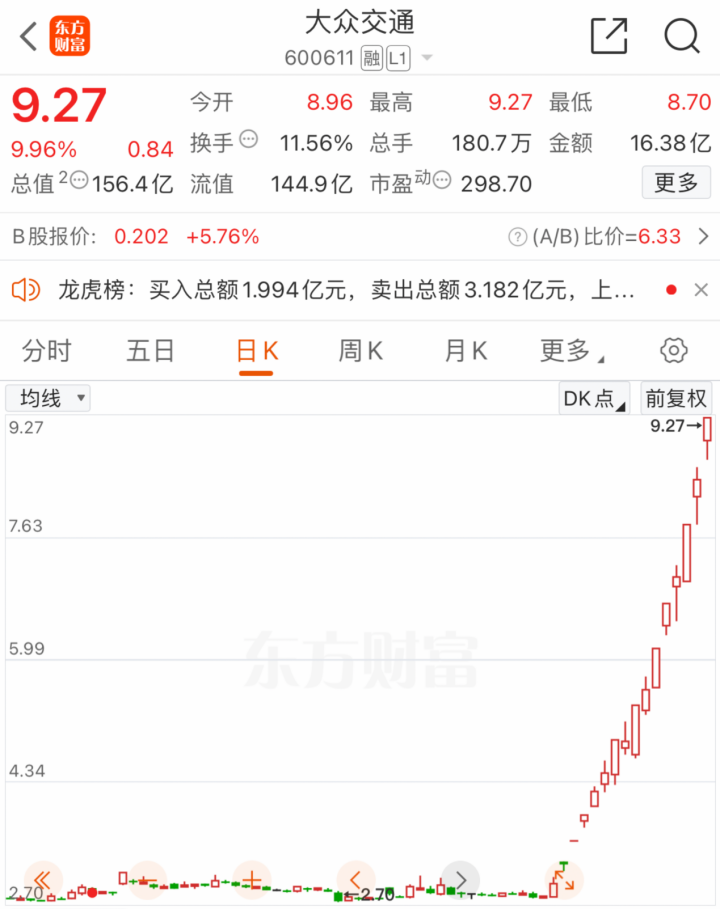 拉长周期来看,大众交通的这一波涨势始于7月8日,资金疯狂涌入、炒作,至今短短16个交易日,累计涨幅高达233%。