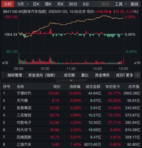 另外,同为新能源汽车领域的蔚来汽车概念股也纷纷上涨。截至收盘,蔚来汽车板块大涨5.28%,板块内8只个股全线上涨,宁德时代涨停。