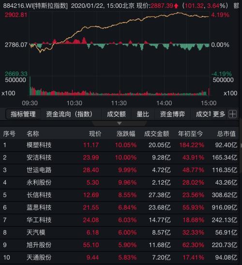 事实上,在特斯拉总市值突破千亿美元大关之前,1月22日A股市场上特斯拉概念股就已掀起涨停潮。