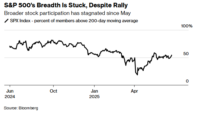 标普500指数已自4月因关税引发的下跌强劲反弹,目前距离历史最高点不到1%。然而,截至目前,一个关键的市场广度指标——标普500成分股中高于其200日移动均线的股票比例——自5月以来几乎没有变化,代表更广泛市场参与度的等权重标普500指数距离去年11月创下的历史高点仍有超过4%的差距。