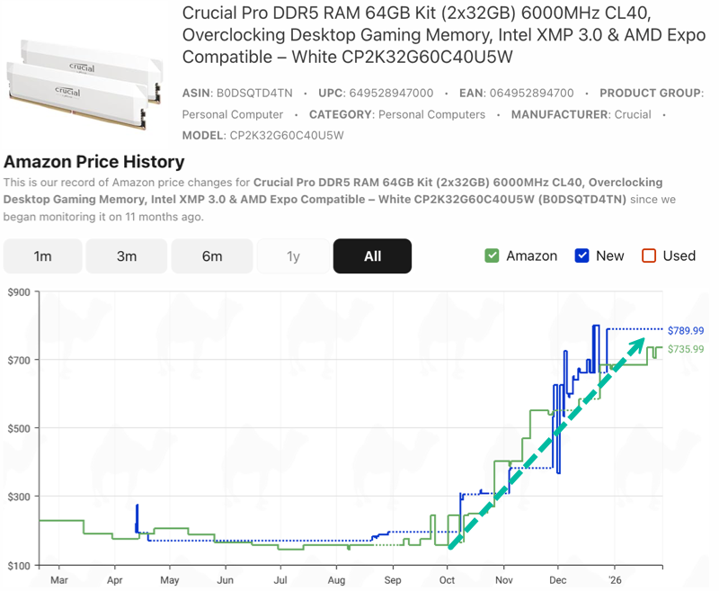 上述说法无疑是正确的。查看亚马逊的价格追踪网站CamelCamelCamel,就可以看到Crucial Pro DDR5 64GB内存的价格呈抛物线式上涨,短短六个月内就从145美元飙升至790美元。
