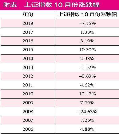 “光辉十月”是最近十多年来A股典型的季节效应之一。以上证指数为例,从2006年到2018年的13年间,仅有4次出现下跌,上升的概率接近七成,是A股表现最好的月份之一。在下跌的4次年份中,2008年和2018年为典型的熊市周期,即使当时10月出现了较大的跌幅,也存在浓厚的“最后一跌”的色彩;而2012年和2013年则是微幅下跌,总体属于大型底部的区间内(见附表)。从股指的角度来看,“光辉十月”具有较好的操作机会,即使短期被套也大概率是“只输时间不输钱”。