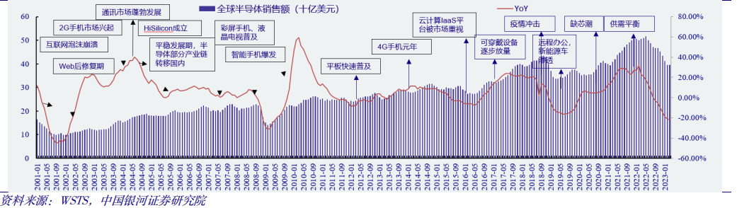 2000年到2023年,全球的半导体销售额不断增长,从最初的约180亿美元的规模上升至2023年的约400亿美元的市场规模,期间的年复合增长率平均保持在20%左右。在2009年随着智能手机的出现,改变了人们的生活方式,全球半导体行业也迎来了爆发式的增长。2014年,4G手机元年的到来和通讯技术的升级,云计算、可穿戴设备、VR/AR 等更多种新型人机交互方式的出现,使得行业对各类半导体需求快速增长。