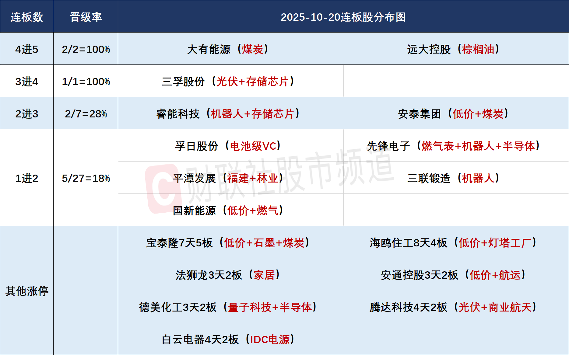 个股方面,全市场超4000只个股上涨,近百股涨停或涨逾10%。连板股表现回暖,上个交易日三连板及以上个股全部晋级,远大控股、大有能源晋级5连板,继续向上拓展连板高度。此外,宝泰隆、德美化工、法狮龙等走出反包涨停。