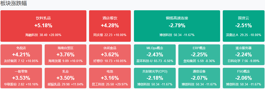 板块方面,海南自贸区、固态电池、大消费板块涨幅居前;铜缆高速连接、国资云、CPO板块跌幅居前。