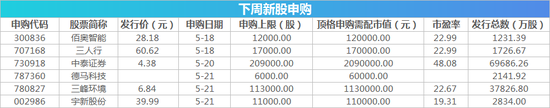 下周共有6只新股申购,分别为佰奥智能、三人行、中泰证券、德马科技、三峰环境、宇新股份。其中,佰奥智能、三人行将于5月18日(下周一)起进行网上申购,申购代码分别为300836、707168;中泰证券将于5月20日(下周三)起进行网上申购,申购代码为730918;德马科技、三峰环境、宇新股份将于5月21日(下周四)起进行网上申购,申购代码分别为787360、780827、002986。