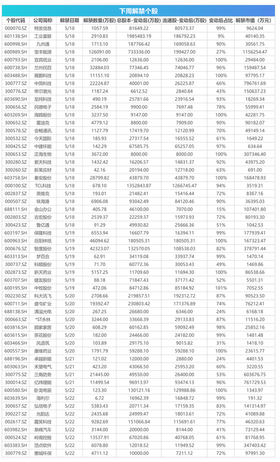 具体到个股,宝丰能源、中简科技、亿纬锂能解禁规模居前,分别为115.63亿元、79.68亿元和76.17亿元,解禁数量分别为12.61亿股、2.22亿股和1.15亿股,占解禁前流通股比例为171.94%、555.48%和14.03%。