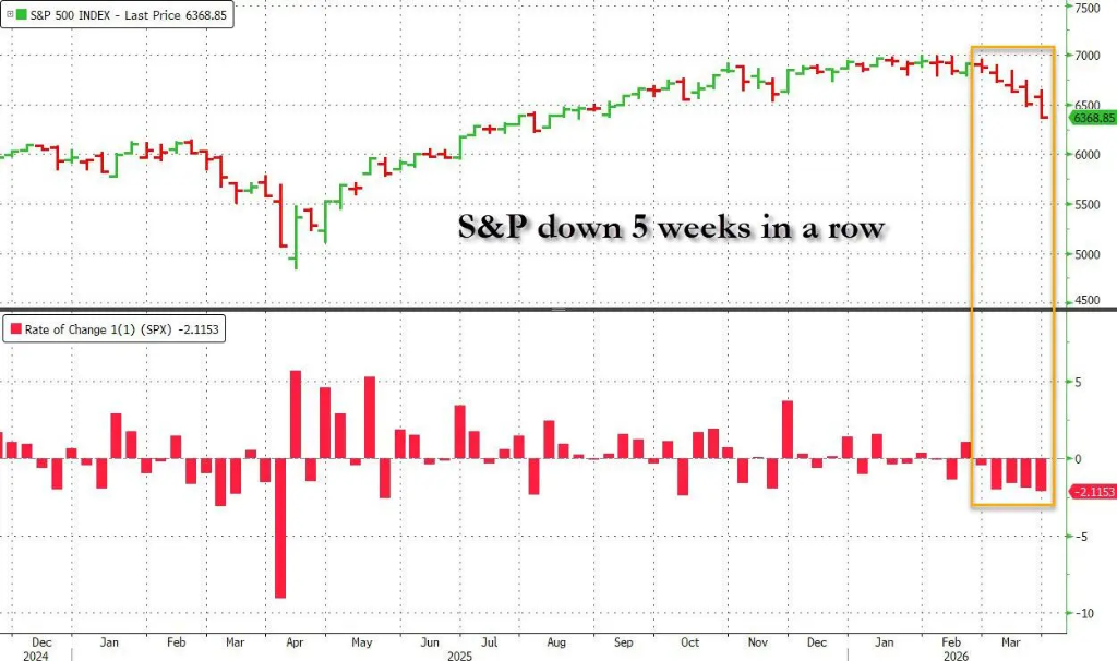 高盛资深交易员Cullen Morgan在周末报告中写道,“周五是近期记忆中最令人不适的交易日之一”。标普500指数创下1970年以来屈指可数的五连跌纪录,此轮下跌的持续性甚至超越了2020年新冠疫情冲击和2025年“解放日”抛售。