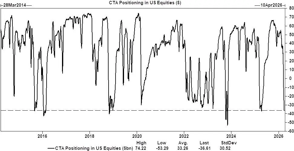 CTA接近多头反转临界点:据高盛估算,过去30个交易日内,系统性策略投资者已累计卖出约850亿美元美国股票,接近历史纪录。目前CTA净空头规模约达370亿美元。摩根报告对此表示,“上行方向存在不对称性——未来一个月内,我们预计CTA在任何情景下均为买入方”,意味着任何正面消息均可能触发空头回补浪潮。