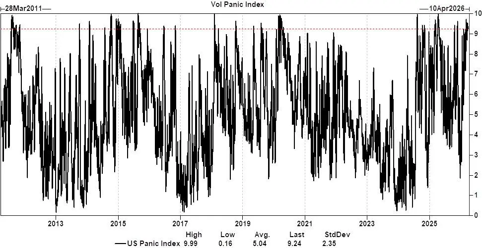 恐慌指数创15年纪录:高盛美股波动恐慌指数达9.2分(满分10分),已连续17个交易日处于恐慌区间,为近15年最长连续恐慌纪录之一。