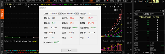 自8月下旬以来,该股股价火箭式窜升,8月19日至9月8日这短短的不到一个月的时间,股价涨近5倍。值得注意的是,涨幅最大的时间段是创业板注册制实施之后,8月24日-9月8日,天山生物涨幅近350%,并且这期间,共录得8个20%的涨停板。
