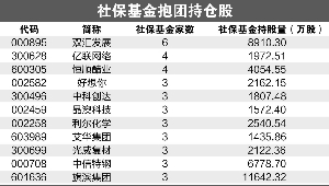 社保基金重仓股中,从前十大流通股东名单中社保基金家数来看,13只个股二季度获3家及以上的社保基金抱团持仓。