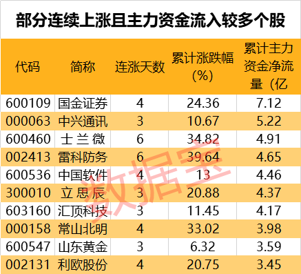 值得注意的是,867只连续上涨个股中,57只个股期间主力资金累计净流入超过亿元。其中,累计资金流入最多的为国金证券,主力资金累计流入7.12亿元。