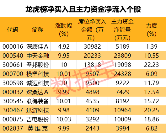 速看!龙虎榜净买入且主力资金净流入个股一览
