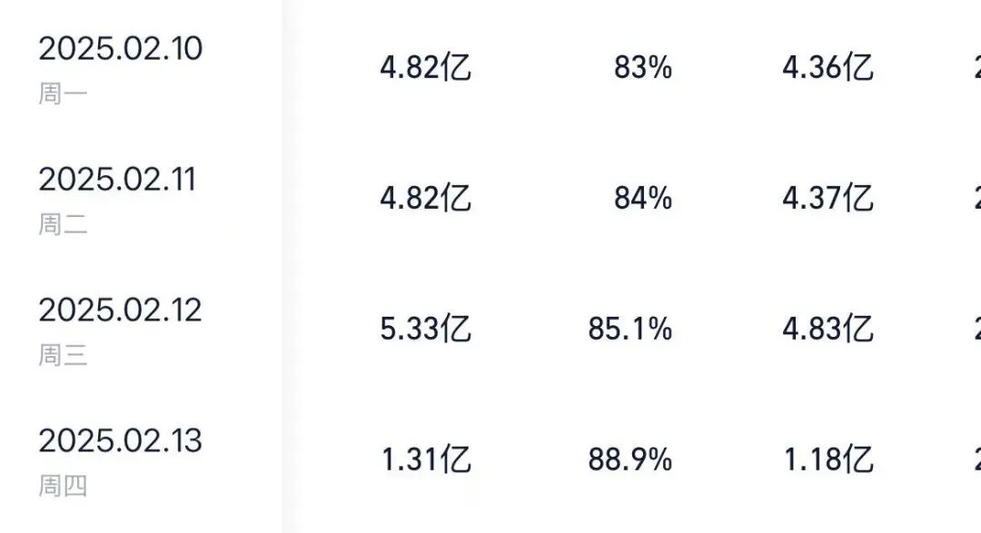 灯塔AI专业版预测显示,今日《哪吒2》票房有望达到4.02亿元,从本周票房数据来看,本周一、二《哪吒2》票房均达到4.82亿元,周三更是达到5.33亿元。这也意味着,《哪吒2》今日票房大概率能超过4亿元。
