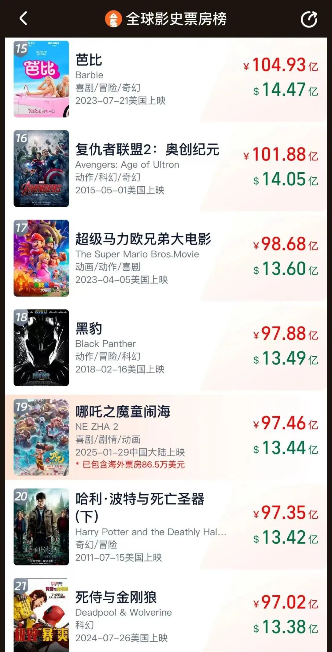灯塔专业版数据显示,截至发稿,《哪吒2》票房已经达到97.46亿元,位列全球影视票房榜第19名,全球动画电影票房榜第4名。