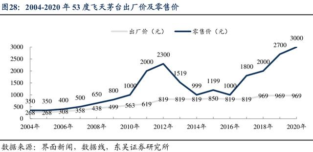 而且站在的茅台的角度看,即便这次一口气涨价了20%,53度飞天茅台的出厂价也不过1169元,距离“官方指导价”1499元仍有30%的差价,距离经销商2000-3000元的终端零售价格,差一倍有余。在当前价格体系下,茅台尚且供不应求,说明后续还有很大的提价空间。