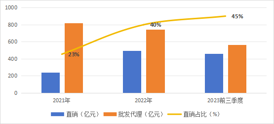 今年前三季度,茅台批发代理收入为566亿元,直销收入为462亿元,批发代理收入占总收入的比重为55%,较2022年的60%进一步下滑。