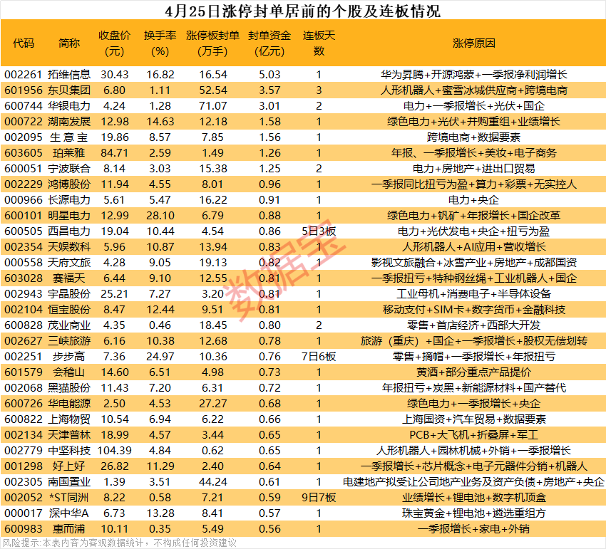 以封单金额计算,7股封单金额超亿元,拓维信息、东贝集团、华银电力等涨停板封单资金居前,分别有5.03亿元、3.57亿元、3.01亿元。