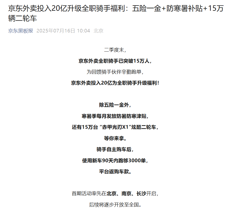 京东重磅宣布:投入20亿元升级全职骑手福利