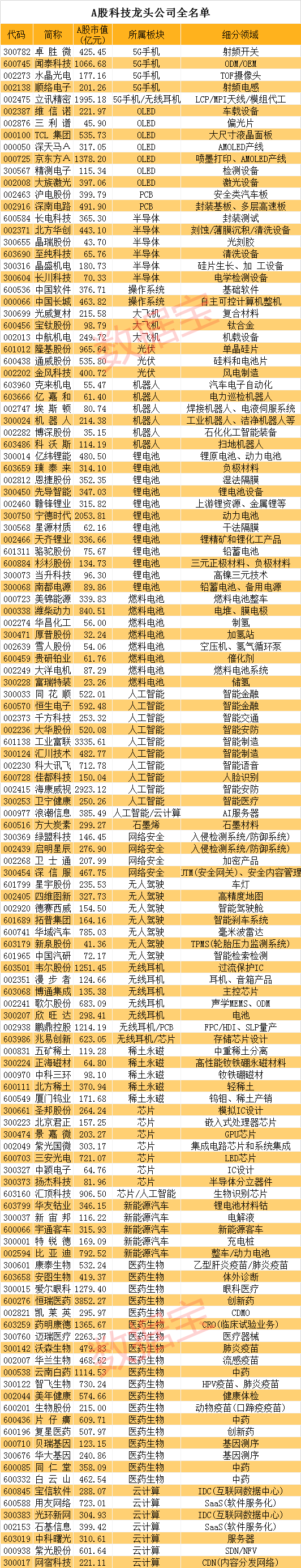 A股科技龙头公司全名单