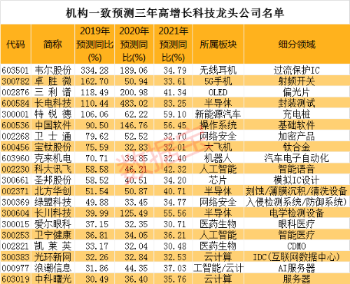 根据5家以上机构一致预测数据,2019年、2020年及2021年三年净利润预测增幅均超过30%的公司,共计20家,包括电源管理类芯片龙头韦尔股份、射频前端芯片龙头卓胜微、智能语音龙头科大讯飞、眼科医疗龙头爱尔眼科、智能医疗龙头卫宁健康等。三年内净利润增幅均值最高的是长电科技,平均预测增速高达225.57%,该公司是公司全球知名的集成电路封装测试企业。(数据宝 梁谦刚)