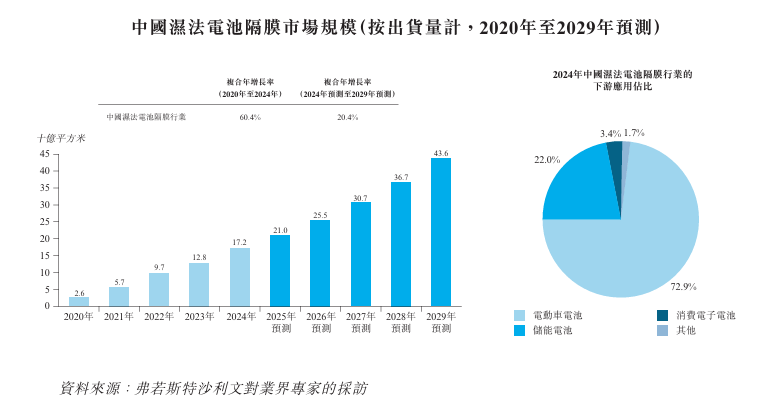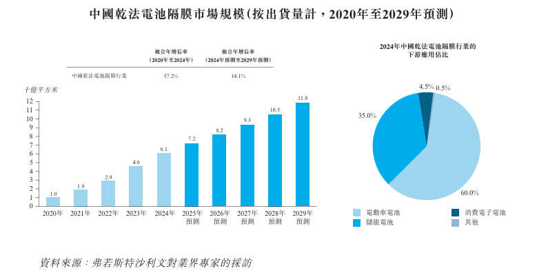 根据弗若斯特沙利文的资料所示,公司是中国首家掌握锂离子电池隔膜干法单向拉伸技术的企业。于往绩期间,公司大部分收益来自中国,2022年至2024年的复合年增长率为10.6%。