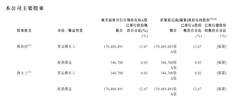 截至2026月1月26日,公司分别由陈教授及陈女士持有约12.67%及0.03%。因此,陈教授及陈女士(陈教授之配偶)有权合共行使约12.69%已发行股份所附带的投票权。